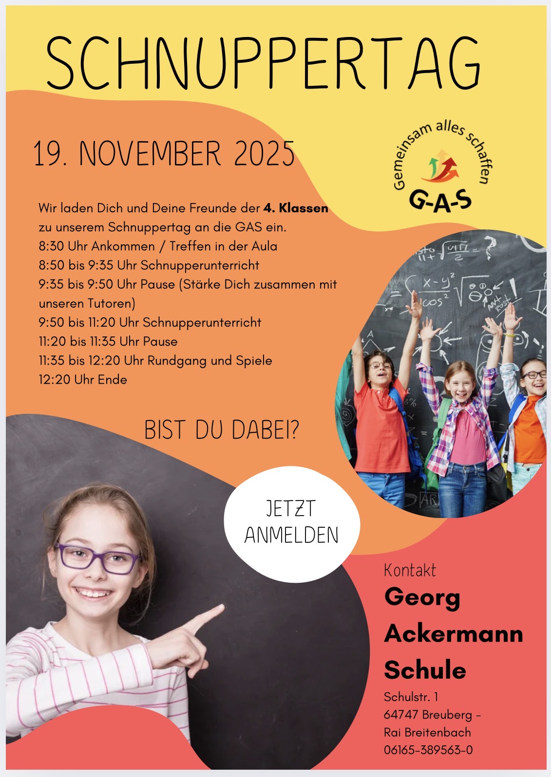 Damit wir diesen Schulbesuchstag planen können bitten wir um Voranmeldung per E-Mail an Diese E-Mail-Adresse ist vor Spambots geschützt! Zur Anzeige muss JavaScript eingeschaltet sein! oder per Telefon unter 06165/3895630 bis Montag, den 17.11.2025.